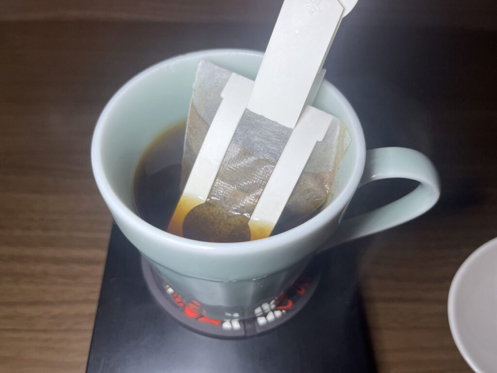 この「揺らす」という動作が、通常のドリップバッグとの違いですね。お湯を注ぐ回数は減りますが、その分しっかり揺らして抽出を促す必要があります。
