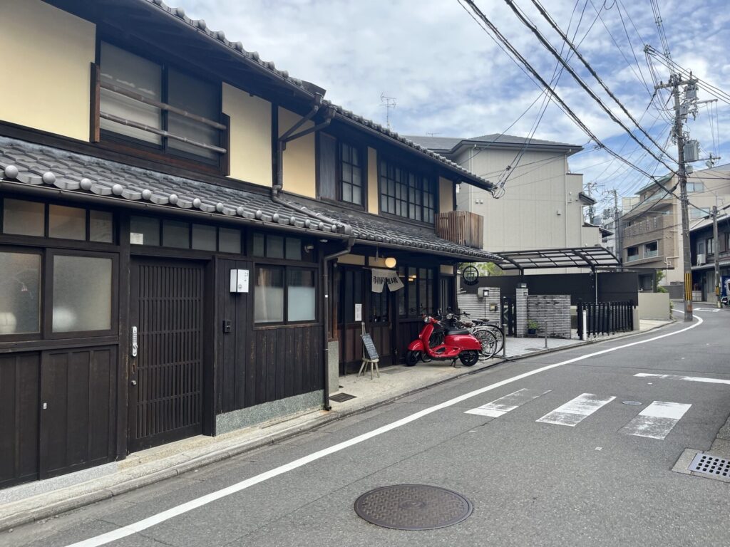 店先には赤いスクーターと自転車が停まっていて、その横には手書きのメニューボード。この何気ない風景が、京都の日常を感じさせてくれます。この佇まいを見ただけで、中での時間が楽しみになってきました。