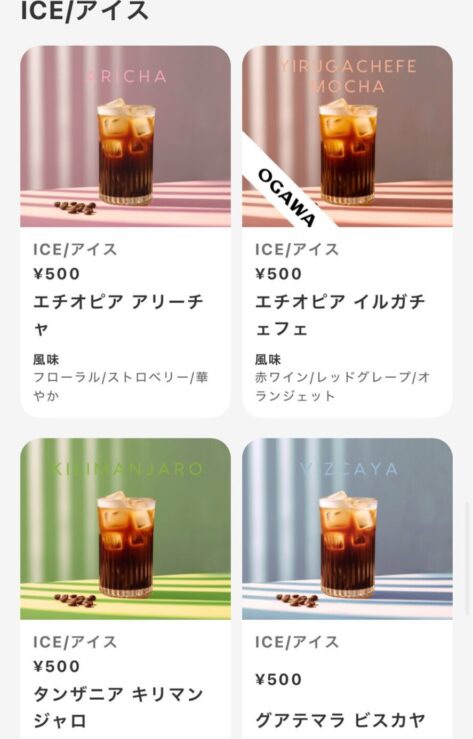 コーヒーはアプリでラインナップをチェックできます。今回は「エチオピア イルガチェフェ」のアイスコーヒーをセレクト。「芳醇な香りとフルーティな甘味が特徴」って書いてありました。他にも味の特徴とかコーヒーのスペック、産地のストーリーなんかも詳しく載っていて、コーヒー好きとしてはテンション上がる情報がいっぱいでした。