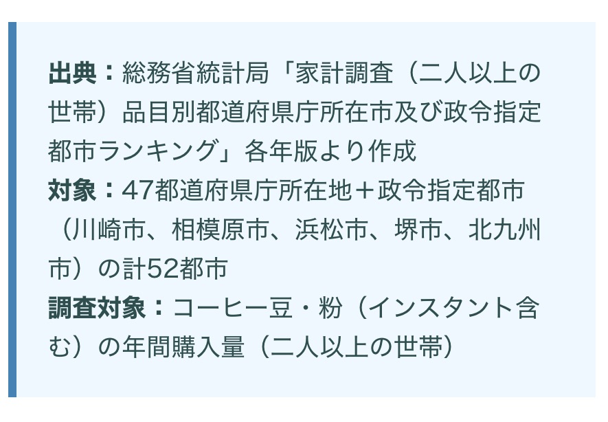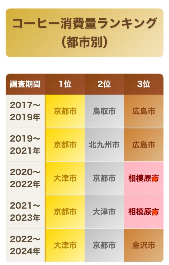 確認してみると、総務省の家計調査によると、確かに2020年から2022年の期間で相模原市が全国3位にランクインしていました。京都市や大津市といったコーヒー文化で知られる都市と肩を並べる結果に、正直驚きました。